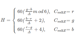 반면, HSV색공간의 경우에는 인간의 시력이 색을 구분하는 방식과 매우 밀접하게 설계된 색공간이므로, 인간의 시각적 인지를 다루는 색공간으로 적합하다. RGB에서 HSV색공간으로 변환하는 식은 다음과 같다.