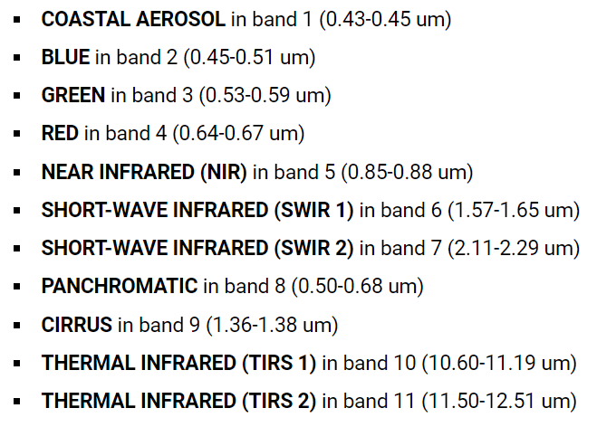 MS의 대표적인 예로는 Landsat-8 sensor로 취득되는 데이터를 들 수 있는데, 11개의 spectral 밴드로 나뉘어진 이 데이터는 다음과 같이 밴드를 나누어 이미지 데이터로 저장된다.