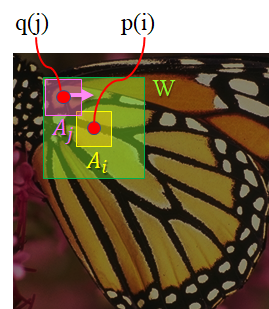 4. 픽셀 p(i)주변에서 비슷한 패턴을 가진 영역을 탐색하기 위한 영역을 W라고 할때, W 내에서 영역 Aj를 sliding window 방식으로 탐색하며 다음의 식을 계산한다.