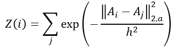 weight의 총합은 1 위의 식에서 exponential 항을 먼저 보면, Ai와 Aj의 euclidean distance 의 제곱, 즉 squared euclidean distance를 계산한 뒤, 표준편차가 a인 gaussian kernel을 적용시시키는것을 알 수 있다. h는 상수인 파라미터이다.