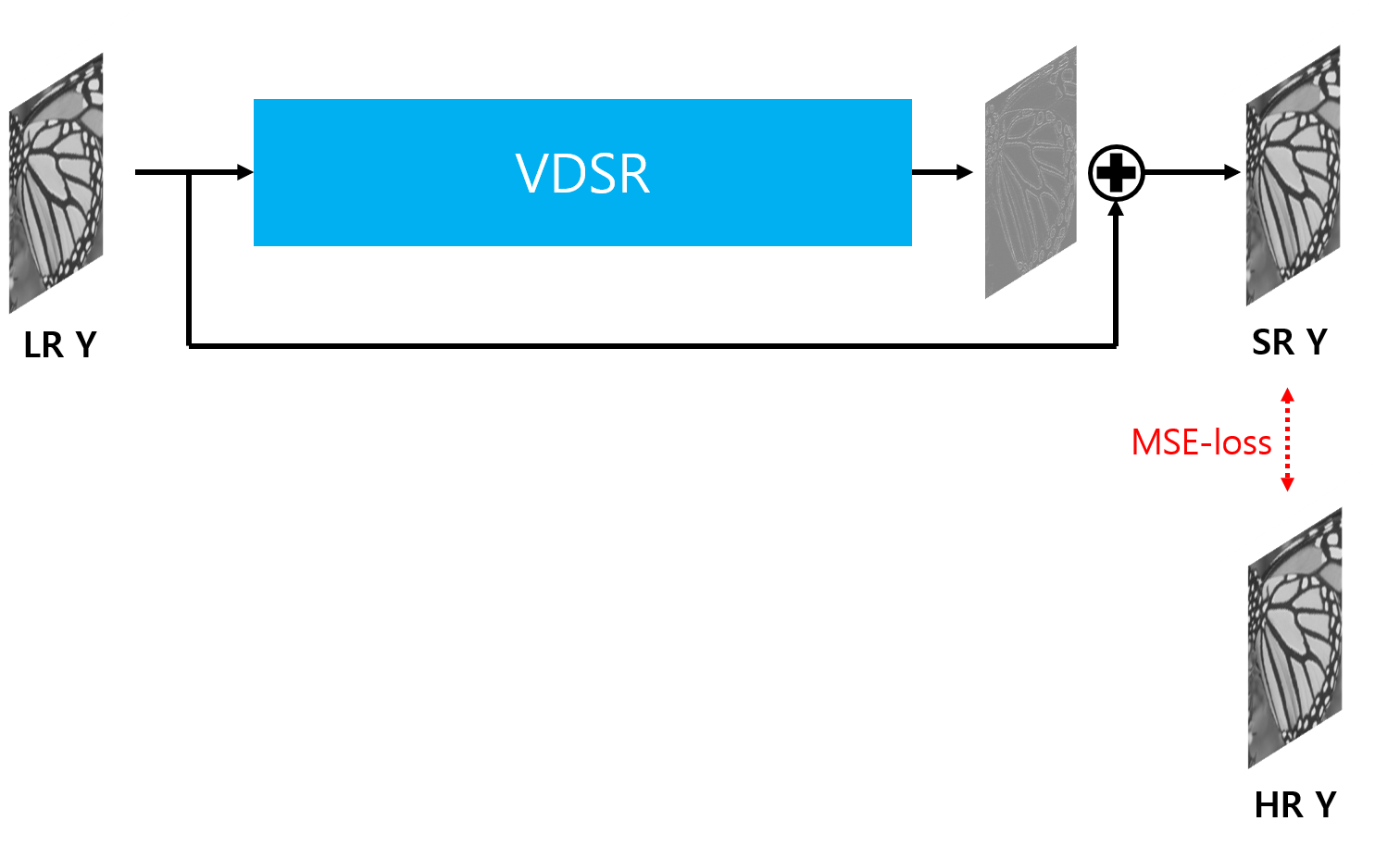 LR image의 Y채널 이미지가 VDSR 네트워크를 통과한 이미지와 LR image의 Y채널 이미지를 더한 뒤 생성된 이미지와 HR image의 Y채널 이미지 사이의 차이를 줄여나가기 위해 MSE-loss를 사용하여 학습을 하게 되며 VDSR 네트워크의 output은 자연스럽게 Residual image가 된다.