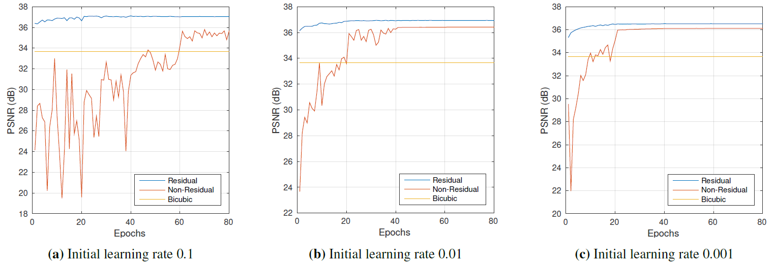 Residual-learning. VDSR의 Residual-learning 은 높은 initial learning rate를 적용시켜도 빠른 Convergence가 가능하게 해준다.