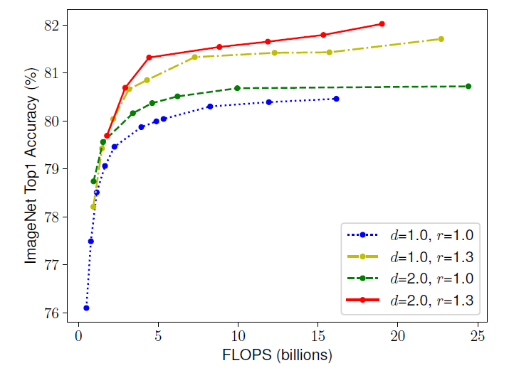 아래의 실험 결과(Fig.3)는 depth와 resolution을 고정하였을때, width의 변화에 따른 성능변화를 관찰할 수 있는 결과이다. 또한, network는 더욱 깊은 depth와 높은 resolution의 조건을 갖을때 더 높은 성능향상이 있음을 관찰할 수 있다.