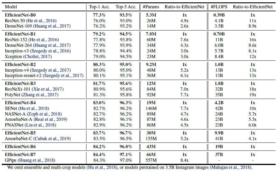 아래 표(Tb. 2)에 나와있는 실험결과는, 비슷한 Top-1, Top-5 accuracy를 보이는 기존의 ConvNet들을 묶어 EfficientNet과 비교한 것이다. 모든 영역에서 일관되게 EfficientNet이 훨씬 적은 parameter수와 FLOPS를 보여주는것을 알 수 있다. (parameter수는 최대 8.4배 적고, FLOPS는 최대 16배 적은 결과이다.)
