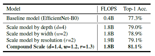 아래 표(Tb. 7)에서는 위 그림(Fig. 7)에서 활용된 실험 network d, w, r조건별 FLOPS와 Top-1 Accuracy를 나타내는 표이다. Compound scaling을 적용한 경우가 비슷한 FLOPS임에도 더 좋은 성능을 보여줌을 알 수 있다.