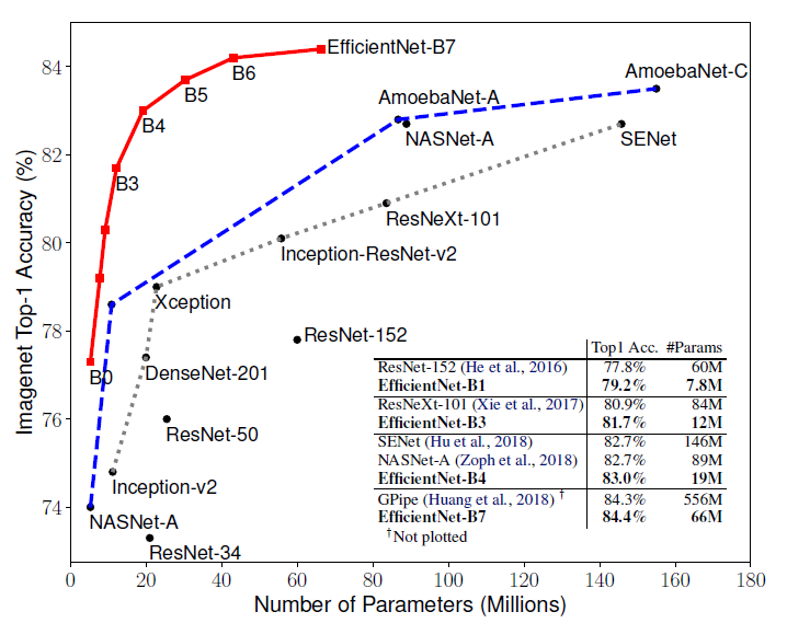 더 나아가, 저자는 'Neural Architecture Search(NAS, 강화학습 기반으로 최적의 network를 찾는 방법)'를 사용하여 baseline network를 설계하였으며 이 baeline network를 scale up 하여 가족 모델인 EfficientNet을 설계하였다. 특히, EfficientNet-B7은 ImageNet dataset에 대해 84.4%(top-1 acc)/ 97.1%(top-5 acc)를 얻었을 정도로 매우 좋은 성능을 보이는데, 이는 최신 ConvNet보다 8.4배 작으며, 6.1배 빠른 성능이다.